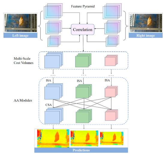 Overview structure of AANet for disparity prediction of chicken images. AANet: adaptive aggregation network. ISA: Intra-Scale Aggregation. CAS: Cross-Scale Aggregation. AA Module: Adaptive Aggregation Module. Each AA Module consisted of three ISA and a CSA.