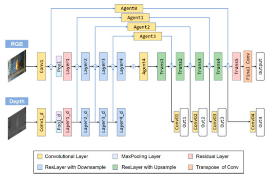 Residual encoder–decoder network (RedNet) is a semantic segmentation network of excellent performance proposed by Jiang et al. [59]. It was utilized to improve the segmentation results by complementing the depth information to RGB signals. The RedNet structure is illustrated in Figure 5. The encoder–decoder network structure [48] was utilized in the RedNet network and the residual block was used as the building module. A pyramid supervision training scheme [59] was proposed to optimize the network. The pyramid supervision training scheme applied supervised learning over different layers in the decoder to avoid the gradients vanishing. Two convolutional branches, the RGB branch and the depth branch were included in the encoder structure, which had the same network configuration, except for the feature channel number of the convolution kernel. The element-wise summation was used for feature fusion.