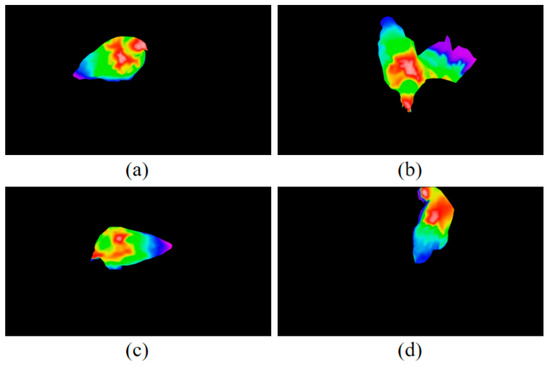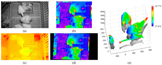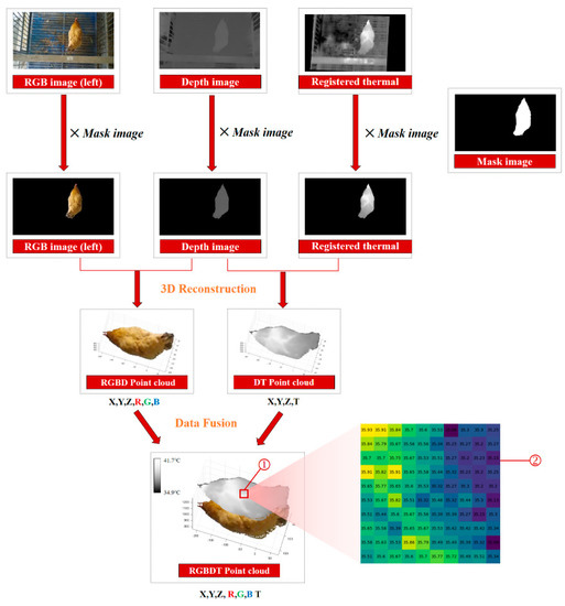 The 3D point cloud of a chicken was reconstructed using the information obtained in the previous steps. An example of a 3D reconstruction with RGB-D-T maps of the chicken is shown in Figure 7. Four kinds of images, including the left RGB image, depth image, registered thermal infrared image and mask image, were utilized as inputs. The following steps were implemented for 3D reconstruction: