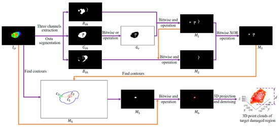 The flow diagram of feather damage detection and extraction. : the thermal infrared image of a chicken. , and : the three channels of the thermal infrared image processed with the Ostu segmentation algorithm. : the image processed with bitwise or operation from the image . : the image processed with bitwise and operation from the images and . : the image processed with bitwise and operation from the images and . : the image processed with bitwise exclusion-or (XOR) operation from the images and . : the schematic diagram of the contours and centroid points extraction from the images and . The centroid points of the top two largest contours in image were extracted, which labeled as and , respectively. The centroid point of the contour in image was also extracted and labeled as . : the target binary image with feather-damaged zone. : the image processed with bitwise and operation from the images and . The image was projected to a 3D coordinate system. A clean point cloud of the damaged region could be acquired after denoising. The difference value d between the minimum and the maximum z coordinate values of the target point clouds was calculated as the predicted depth of the feather-damaged region.