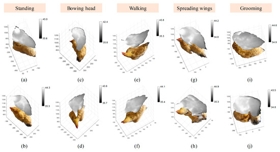 RGB-D-T point clouds for five postures of chicken generated by the proposed 3D reconstruction method: (a,b) “standing” posture; (c,d) “bowing head” posture; (e,f) “walking” posture; (g,h) “spreading wings” posture; (i,j) “grooming” posture. RGB-D-T: RGB-Depth-Thermal.