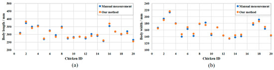 Comparison of the manual measurement method and our method for the: (a) body length; and (b) body width.