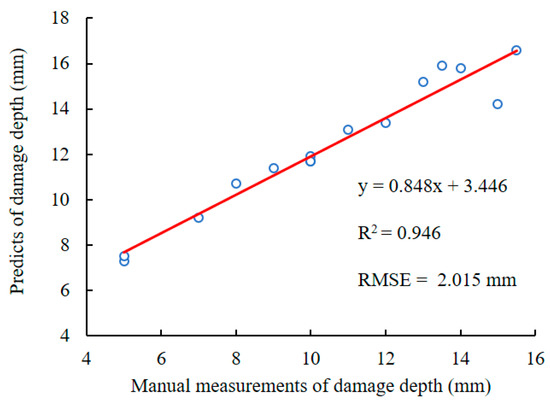 Linear regression for feather damage depth based on the predicted results with manual measurements.