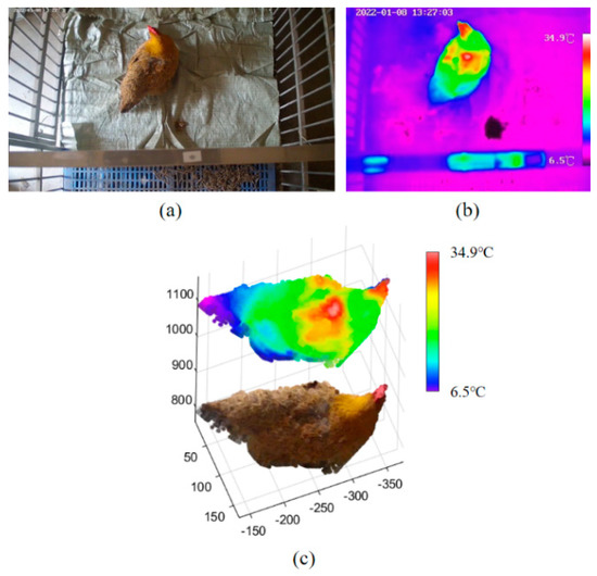 Sample of chicken point clouds with feather damage: (a) RGB image with feather damage; (b) thermal infrared image with feather damage; (c) RGB-D-T point clouds with feather damage. RGB-D-T: RGB-Depth-Thermal.