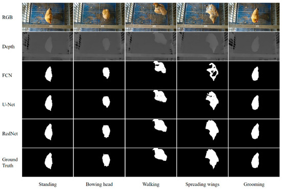 Although much progress was achieved in previous studies on 3D reconstruction with multi-source information, the following problems need improvements: (i) Traditional stereo matching algorithms suffered in challenging situations, such as in weak texture regions and repetitive patterns, which led to considerable errors in estimated depth data [44]. (ii) Typically, an RGB image is of high resolution and has rich texture information, while the thermal infrared image is of low resolution and has poor texture details. Traditional feature-based image registration methods [45] calculate the optimal homography matrix by establishing a correspondence between the two sets of key points [46]. However, the accuracy of these methods depends on the numbers of detected key points and the correct key points correspondences, which may be difficult to apply and cannot guarantee the fusion of heterogeneous images. (iii) The segmentation process of the RGB images for chickens is important for the accuracy of the reconstruction. The fully convolutional networks (FCN) [47], U-Net [48] and other fully convolutional-based networks, such as SegNet [49] and DeepLab [50], have shown great potential in semantic segmentation tasks. Nevertheless, the chicken’s claws are very thin and the feathers are easily confused with the surrounding background, which increases the complexity of the task.