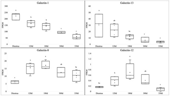 In the endometrium, galectin-1 (p < 0.01), galectin-8 (p < 0.01), galectin-12 (p < 0.01), and galectin-13 (p = 0.01) were altered during gestation (Figure 1). Two profiles could be noted for these galectins. Both galectin-1 and galectin-13 had the highest expression in the diestrus nonpregnant endometrium, and this then declined linearly towards parturition, with the lowest expression levels noted in the 330 d endometrium. In contrast, galectin-8 and galectin-12 were lowest in terms of expression in the diestrus endometrium. The highest expression levels were noted for both these galectins in the 120 d endometrium, followed by a linear decline towards parturition.