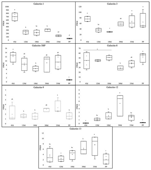 Next-generation RNA-seq was carried out on both chorioallantois and endometrium. Briefly, sequencing libraries were generated using the NEBNext® Ultra™ RNA Library Prep Kit for Illumina® (gSan Diego, CA, USA), following the manufacturer’s recommendations. Library preparations were sequenced on NovaSeq 6000, and 125 bp/150 bp paired-end reads were generated. The reads were then trimmed for quality and adapters with TrimGalore 0.4.3 and then mapped to EquCab3.0 using hisat2 v2.1 [21]. The expression values (fragments per kilobase measured; FPKM) of the mapped reads were quantified using FeatureCounts for v1.5.0 [22], with the NCBI annotation (GCF_002863925.1). The expression of galectin-1, galectin-2, galectin-3, galectin-3BP, galectin-4, galectin-5, galectin-6, galectin-7, galectin-8, galectin-9, galectin-9B, galectin-10, galectin-11, galectin-12, galectin-13, galectin-14, galectin-15, galectin-L, and GRIFIN was assessed.