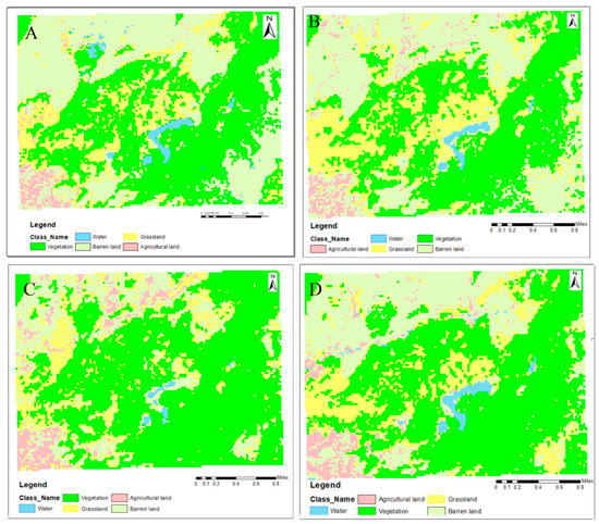 Patterns of land use and land cover from 1989–2021. (A) LULC of the RWC for 1989; (B) LULC of the RWC for 2000; (C) LULC of the RWC for 2010; and (D) LULC of the RWC for 2020.