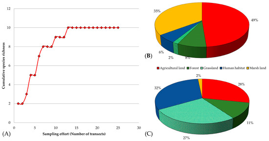 The overall Shannon–Weiner diversity index (H’) of herpetofauna was 1.88312 and the evenness index (E) was 0.3642. The diversity index (H’) and evenness index for amphibians were 1.2892 and 0.6211, respectively and for the reptiles, 1.2825 and 0.7213, respectively. The species accumulation curve reached an asymptote (Figure 3A), indicating that there were no prospects of finding new species even with increased sampling efforts [53]. The presence of 179 individuals of 11 species (5 amphibians and 6 reptiles) in this field study implies that the herpetofaunal diversity is likely impacted by the time of study period (post monsoon). Due to the minimal rainfall during the post-monsoon season, species discovery may have been limited. Similar findings of reduced herpetofaunal diversity in pre-monsoon season have been noted by others [54]. Among the 11 species of herpetofauna identified, Duttaphrynus melanostictus was the most abundant species in the area. However, according to local people, the area also has tree frogs which were not observed during this study. The family Dicroglossidae was largest for amphibians and the family Scincidae was largest for reptiles. Calotes versicolar was recorded at an altitude of 2540 m asl in this study. Previous reports have identified this species in a variety of terrestrial environments below 2000 m asl [40].