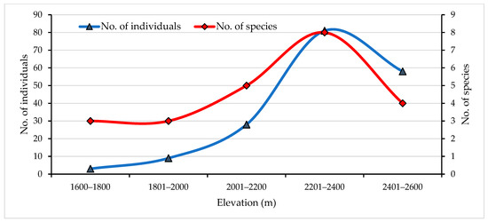This study revealed a hump-shaped distribution of the herpetofauna along the elevation gradient of the RWC (Figure 4). Herpetofaunal species richness and abundance gradually increased with increasing elevation that peaked at 2201–2400 m asl and dropped off beyond that. The hump shaped relationship between species richness and elevation in this study might be because the RWC’s major wetlands are situated at 2100–2500 m asl, providing both wet and dry conditions for herpetofaunal assemblage which is fundamental for their various life stages. Additionally, many amphibians have relocated their ranges towards higher elevations due to the growing effects of global warming and climate change [61,62]. Similar altitudinal richness patterns have been documented on the diversity of plants, frogs, lizards, snakes, birds and small mammals along elevation gradients of Himalaya and adjoining mountain rages [63,64,65,66,67,68,69]. However, a monotonic decline in amphibian richness and abundance also has been recorded from the eastern Nepal Himalayas [70] which could be due to a majority of recorded amphibians inhabiting a narrow elevational range.