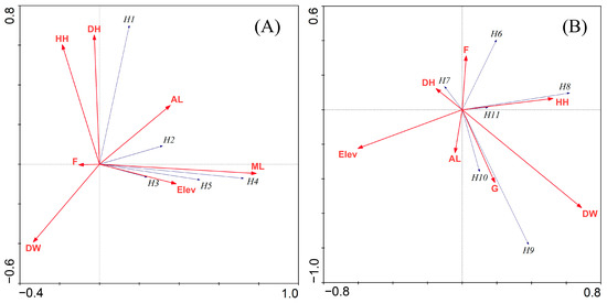 RDA ordination diagram (biplot) showing the association of environmental variables with the herpetofauna in the RWC; (A) Amphibians; and, (B) Reptiles. Note: F = Forest, ML = Marsh Land, AL = Agricultural Land, G = Grassland, HH = Human Habitat, DW = Nearest distance to water resource, Elev = Elevation, DH = Nearest distance to human settlement.