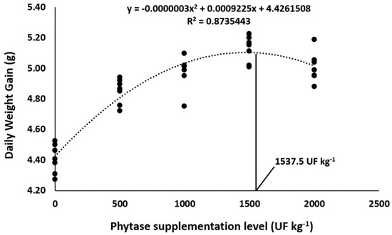 Daily weight gain of Nile tilapia fed diets supplemented with graded levels of phytase. The black points represent the seven replicates of each dietary treatment. Lines were used to mark the optimum supplementation level of phytase determined by the quadratic regression.