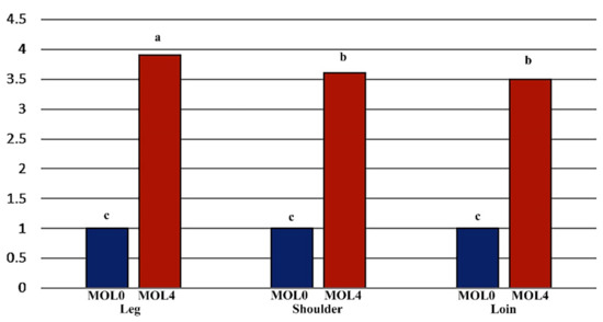In our investigation, the lambs that used MOL4 had a higher weight for the leg, loin, and shoulder than the lambs fed with MOL0. This is probably due to the higher final body weight of lambs fed with MOL4. In the same way, Karami et al. [58] showed that adding turmeric supplements to the diets of goats improved longissimus muscle and decreased back fat thickness. Dudko et al. [59] also demonstrated that including Oreganum vulgare and citrus supplements in the diets of growing lambs increases the depth of longissimus dorsi muscle and reduces back fat thickness. In the current study, lambs fed with MOL4 had a higher lean-to-bone ratio than the lambs fed with MOL0. This is probably due to the higher lean meat weight of lambs fed with MOL4. Furthermore, it has been shown that adding the herb–clover mixes (red and white clovers, chicory, and plantain) in the ratios improves lean to bone ratio [60].