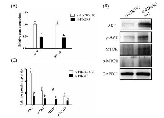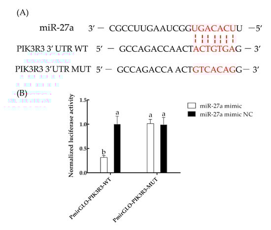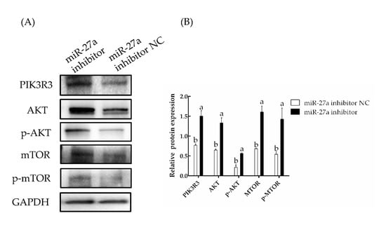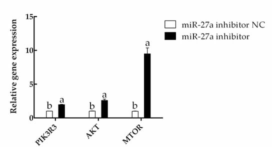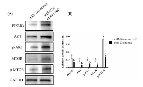 3.2. The miRNA miR-27a Targets PIK3R3 and Downregulates the AKT/MTOR Pathway