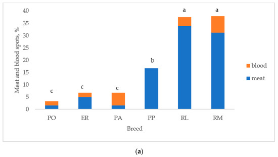 Figure 5 reports the albumen and yolk inclusions of the eggs laid by the breeds. As previously indicated, the white eggshell breeds were considered as two breeds (PA and PO) to test differences between breeds. Figure 5a reports the breeds according to the increasing values of total inclusions: PO, ER, and PA differed (p < 0.05) from RL and RM, which were similar. PP was intermediate between the first three breeds (p < 0.05) and RL and RM (p < 0.05). Total inclusions (Figure 5b) differed (p < 0.05) between white and tinted eggshell breeds for a higher (p < 0.05) presence of meat spots in the tinted eggshell breeds, whereas blood spots were similar.