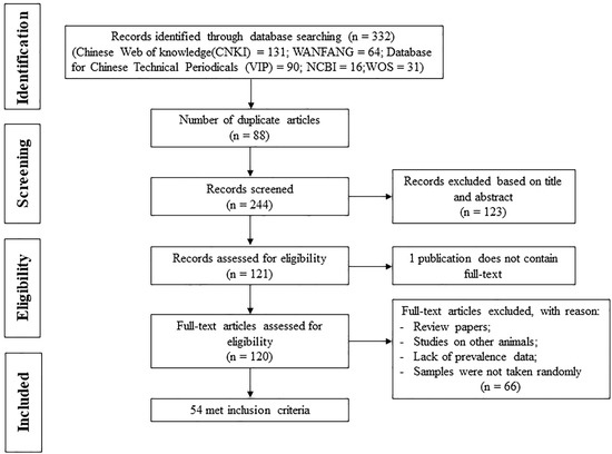 Literature exclusion criteria: (1) the source of the reported samples and animal species was unclear, and the data were incorrect or incomplete; (2) samples were not randomly selected; (3) duplicate publications, conference publications, articles given to the editor, review articles, no full text or insufficient information, etc.