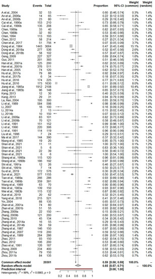 In this meta-analysis, based on the I2 test, we observed a high degree of heterogeneity regarding the prevalence of Chinese ruminants among eligible studies. This may be related to detection method, age, region, year of sampling, year of publication, and host.