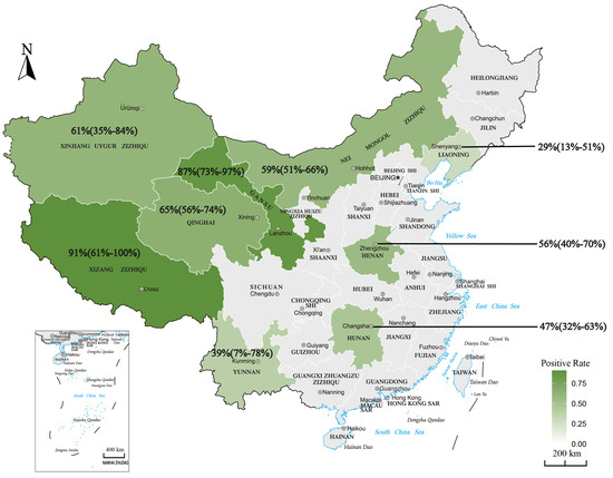 The infection rate varied significantly by region in China (p < 0.01), with the highest prevalence of Sarcocystis infection in northwest China (10,205/15,919, 67%, 95% CI: 59–75%) and the lowest in northeast China (7/24, 29%, 95% CI: 13–51%) (Table 3, Figure 3). Significant differences in Sarcocystis infection were found among provinces (χ2 = 30.05, d.f. = 8, p < 0.01, I2 = 99%). The prevalence of Sarcocystis infection (7%) was lowest in Yunnan and highest (100%) in Tibet.