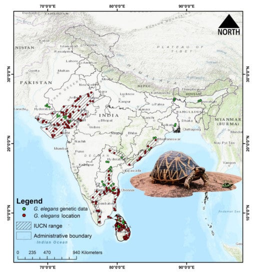 The genetic data has been evidenced as a successful tool in conservation genetics and facilitating the rapid return of trafficked turtles back to the wild [15]. In this milieu, the present study aimed to examine the genetic diversity of G. elegans throughout its distribution range. In addition, species distribution modeling is often able to develop substantial knowledge of the habitat and biogeography of many chelonian species under past, current, and future climate conditions [16,17,18]. These spatial data also provide an appropriate means of reintroducing many threatened species after successful breeding or confiscation and help establish effective conservation management [19,20]. Owing to the guidelines of a multilateral conservation treaty, the present study further aimed to determine the suitable habitat of G. elegans through distribution modeling (SDM) to forecast a piece of vital information regarding the prioritized area for developing conservation and management in the Indian subcontinent.