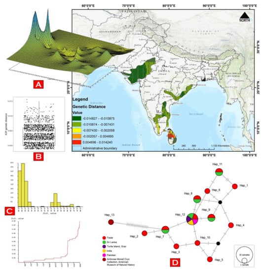 The bi-directional chromatograms were screened using a SeqScanner version 1.0 (Applied Biosystems Inc., Waltham, CA, USA), and the noisy parts were trimmed from both ends to avoid the nuclear mitochondrial DNA segments (NUMTs). The consensus sequences were reviewed through the nucleotide BLAST (https://blast.ncbi.nlm.nih.gov, accessed on 25 November 2022) and ORF finder (https://www.ncbi.nlm.nih.gov/orffinder/, accessed on 25 November 2022) search tools to confirm the appropriate amino acid array of the vertebrate mitochondrial genome. The spatial patterns of genetic divergences were investigated through a genetic landscape shape interpolation analysis using the Alleles in Space v1.0 program [23]. The Kimura-2 parameter (K2P) genetic distances were calculated through the MEGA11 program [24]. The representation of intraspecific genetic distances was plotted through BoxPlot in RStudio (https://posit.co/). To estimate the molecular operational taxonomic units (MOTUs), the Automatic Barcode Gap Discovery (ABGD) and Poisson Tree Processes (PTP) were applied [25,26]. The ABGD analysis was executed on the web server (www.abi.snv.jussieu.fr/public/abgd/, accessed on 25 November 2022) using the Jukes-Cantor (JC69) model. The maximum-likelihood tree was constructed in RAxML v2.0.1 to perform the PTP analysis (http://species.h-its.org/ptp/, accessed on 25 November 2022) [27]. The number of unique haplotypes, the number of polymorphic sites, and haplotype diversity (Hd) were estimated by DnaSP 6 [28]. The TCS networks of all haplotypes were constructed in POP-ART [29,30].