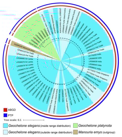 A total of 46 mtCytb sequences of G. elegans and 7 sequences of G. platynota were acquired from GenBank and aligned by ClustalX to build a final dataset (458 bp) [31]. The sequence of Manouria emys (DQ080040) was also acquired from GenBank and used as an outgroup in the phylogenetic inference. The suitable model was confirmed using Mr. MODELTEST v2 with the lowest BIC (Bayesian information criterion) score [32]. The Bayesian (BA) phylogeny was built in MrBayes v3.1.2 with a GTR + G + I model with one cold and three hot chains and run for 600,000 generations with 25% burn-in, trees saving at every 100 generations, and other default parameters [33]. The generated BA tree was illustrated through the web-based iTOL tool (https://itol.embl.de/) [34].