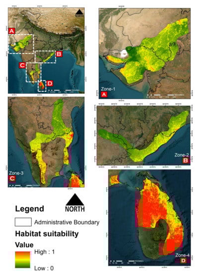 Representing the probability of suitable habitats of G. elegans within the distribution range. (A) Zone-1 comprising the western range within Gujarat and Rajasthan of India; (B) Zone-2 comprising the eastern range within Odisha and Telangana, and the north-eastern portion of Andhra Pradesh of India; (C) Zone-3 comprising the southern range within Tamil Nadu and Karnataka, and the central to southern parts of Andhra Pradesh; (D) Zone-4 comprising the north-western to south-eastern regions within Sri Lanka.