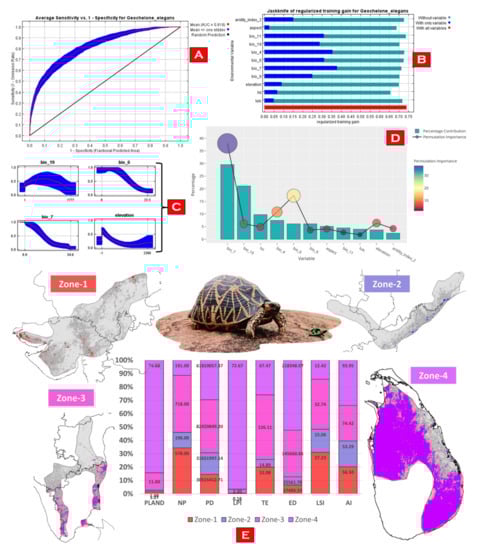 For the comparative habitat quality estimation between the ranges, we have designated the ranges into a total of four zones, i.e., zone 1 (comprising the western range within Gujarat and Rajasthan in India); zone 2 (comprising the eastern range within Odisha and Telangana, and the north-eastern portion of Andhra Pradesh in India); zone-3 (comprising the southern range of Tamil Nadu and Karnataka, and the central part of Andhra Pradesh in India); and zone 4 (comprising the north-western and south-eastern portions of Sri Lanka) (Figure 5E). Our results suggest that zone 4 constitutes about 74% of the total suitable areas for the species, followed by zone 3 with 11.60%. Habitats within the Sri Lankan range were found to be the best for G. elegans, with the lowest score of NP (191) and high values of LPI (72.67), suggesting habitat continuity and less habitat fragmentation (Figure 5E). Moreover, the continuity and habitat quality can be also observed through the comparatively high value of AI (93.95) within the Sri Lankan range. However, zone 3 and zone 1 depicted high NP, PD, TE, and LSI, suggesting a substantial level of habitat fragmentation in the region (Figure 5E).