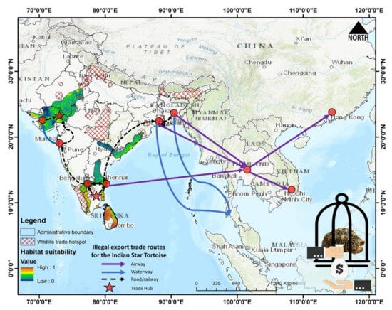 Comparative visualization of the suitable ranges for G. elegans, along with illegal wildlife trade hotspots (https://www.wpsi-india.org/crime_maps/trade_hotspots.php, accessed on 25 November 2022) and the domestic and international illegal export trade routes of G. elegans (D’Cruze et al., 2015). The species photograph was acquired from the free media repository Wikimedia Commons.