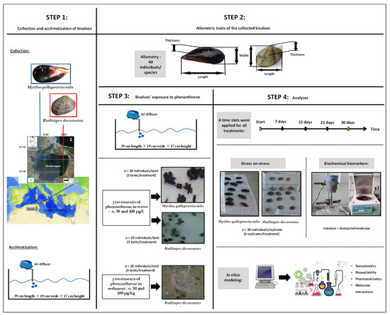 Traditionally, the ecotoxicological studies relating pollutants and bivalves focused on acute (i.e., effects of short-term exposure, 24–96 h) and single-bivalve species. These classic studies also used a predefined set of endpoints, such as accumulation rate, shell allometry, mortality rate, and enzymatic activities. However, it is known that exposure to PAHs has multiple, often interlinking, effects on marine species and a comprehensive understanding of the overall process is still missing [19,20,21,22,23]. Further, the effects of chronic (i.e., longer-term) exposure are even less understood [25]. Therefore, the aim of the current study was to provide a better understanding of the multiple effects of phenanthrene on marine fauna by using three novel approaches. First, we simultaneously exposed two species of bivalves, the mussel Mytilus galloprovincialis and the clam Ruditapes decussatus, to increasing concentrations of phenanthrene. The second approach was to assess the toxic impact on both species by measuring the changes in time of various morphometric and mass end-points, as well as through neurotoxic and oxidative stress biomarkers, during a chronic exposure experiment (i.e., 7, 15, 21, and 28 days). In the third approach, bioaccumulation and high toxicity were linked to the toxicokinetics and toxicodynamics of phenanthrene, as well as its bioavailability. Such attributes mainly depend on the physico-chemical parameters of the pollutant itself, similar to several toxicants including PAHs using combined in silico and in vivo/in vitro approaches. Overall, the novelty and strength of the current study is twofold: it focused on the chronic rather than acute exposure and combined in vivo experiments with in silico tools, which is a relatively new investigation pathway in current ecotoxicological studies.