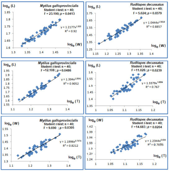 Regressions relating linear parameters in bivalve species Mytilus galloprovincialis and Ruditapes decussatus. Length (L); Width (W); Thickness (T).