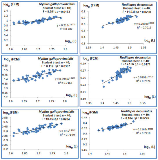 Regressions relating length and masses in bivalve species Mytilus galloprovincialis and Ruditapes decussatus. Total Fresh Mass (TFM); Fresh Chair Mass (FCM); Fresh Shell Mass (FSM), Length (L).