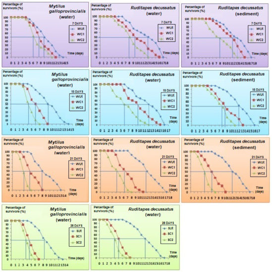 The values of LT50 registered for R. decussatus support the assertion of higher toxicity of phenanthrene following the sediment contamination compared to water exposure, given that the LT50 declined faster in the former milieu. This result is in accordance with that of [71] in contaminated sediments with pesticides. The results of the current study showed that the sensitivity thresholds to phenanthrene for both bivalves decreased with exposure time.