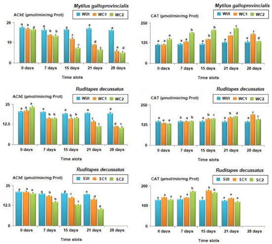 The concentrations of AChE were similar for control individuals during all time slots (i.e., 7, 15, 21, and 28 days, 1-ANOVA: df = 10, F = 44.109, p-value = 0.893, Figure 5). The AChE activities in WC1 significantly decreased (1-ANOVA: df = 10, F = 87.520, p = 0.037, Tukey’s HSD test: p-values < 0.05) after the 7th day of exposure, being reduced by 21.3%; the lowest levels were reached at the end of the experiment, with a 46.2% reduction (Figure 5). The AChE activities were also significantly lower in WC2 compared to WUt for the same time slot (7 days: 1-ANOVA: df = 6, F = 116.008, p = 0.0389/15 days: 1-ANOVA: df = 6, F = 92.145, p < 0.0257/21 days: 1-ANOVA: df = 6, F = 138.211, p < 0.01/28 days: 1-ANOVA: df = 6, F = 77.946, p < 0.01) (Tukey’s HSD test, p-values < 0.01, Figure 5).
