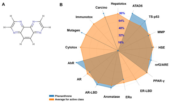 The chemical structure of phananthrene (A) and the average biomarker responses related to its toxicodynamics as compared to the average of class compounds (B). Cytox: Cytotoxicity; Mutagen: Mutagenicity; Immunotox: Immunotoxicity; Carcino: Carcinogenicity; Hepatotox: Hepatotoxicity; ATAD5: ATPase family AAA domain-containing protein 5; TS-p53: Tumor Supressor (Phosphoprotein) p53; MMP: Mitochondrial Membrane Potential; HSE: Heat shock factor response element; Nrf2/ARE: Nuclear factor like 2/antioxidant; PPAR-γ: Peroxisome Ploriferator Activated Receptor Gamma; ER-LBD: Estrogen Receptor Ligand Binding Domain; ERα: Estrogen Receptor Alpha; AR-LBD: Androgen Receptor Ligand Binding Domain; AR: Androgen Receptor; AhR: Aryl hydrocarbon Receptor.