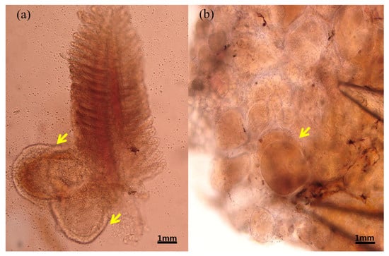 Macroscopic view of a 10× gill tissue slice (a) and a 10× fin tissue slice (b). Yellow arrow is a hyaline capsule.