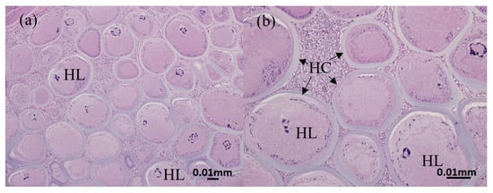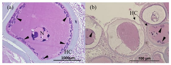 Histopathological findings of hypertrophic lymphocystis cells. (a) 40× view and (b) 40× view. HL: hypertrophic lymphocystis cell; HC with arrow: hyaline capsule.
