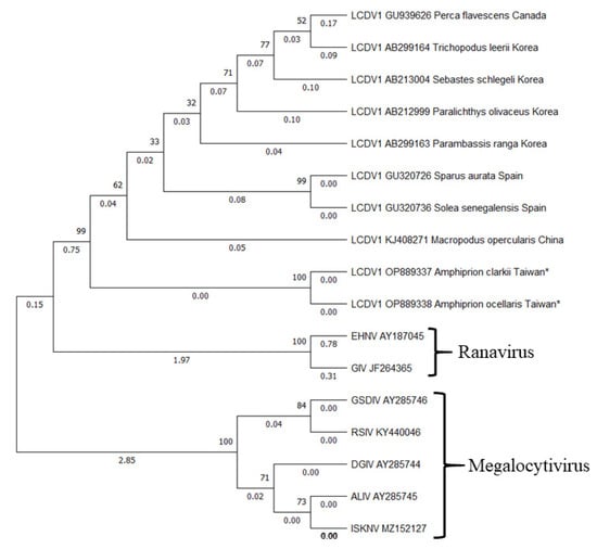PCR amplicons from A. ocellaris and A. clarkii were sequenced by the Tri-I Biotech Company, New Tapei City, Taiwan. Initial comparisons with sequences in the GenBank Entrez databases were performed using BLAST (http://www.ncbi.nlm.nih.gov (accessed on 28 November 2022) to identify homologous sequences. The Bioedit Alignment Sequence Editor Ver. 7.0.5.3 was used to assemble and edit the forward and reverse sequences of MCP regions. The original chromatograms are compared manually if necessary. Obtained sequences were aligned with the previously characterized sequences of Iridovirus (Table 1) registered in GenBank by using Bioedit Alignment Sequence Editor Ver. 7.0.5.3 (Informer Technologies, Inc., Rheinland-Pfalz, Germany). The MEGA version 11 [] was conducted for phylogenetic and molecular evolutionary analyses. Retrieved MCP region sequences are listed in Table 1. The maximum likelihood polygenetic tree and the pairwise distance were constructed by using MEGA 11 software by bootstrap analyses using 1000 resamplings.