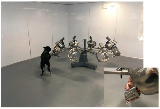 Prior to this study, all three dogs had undergone generic detection training following a similar method to that outlined for Customs Service narcotics detection dogs [29]. Training began by encouraging the dogs to detect a familiar toy (ball) by odour rather than sight. The dogs’ behaviour was then shaped over subsequent sessions, using positive reinforcement, to a consistent sit and forward focus once they had found the ball. An easily identified secondary odour, in this case a food spread, was then placed alongside the ball until the dogs learned to associate the two odour patterns. The ball was then removed, and only the secondary odour was hidden. A positive indication on the secondary odour was immediately rewarded with release of the ball. Eventually, the ball was replaced with an immediate verbal release, a high-pitched “yes”, that signalled an end to the search and was followed by a reward. The use of a secondary odour was standard practise for the dog trainer, as it allowed simulation of various narcotics detection search scenarios where the odour was concealed in a way that would not have been practical for a large item, such as a ball, and where the eventual target odour was difficult to detect or not consistently available. In this case, once the dogs were consistently indicating the secondary odour, they were then introduced to the odour-detection carousel. This was located in a purpose-built room at the training centre where the dogs resided. The carousel was a stainless steel structure on a rotatable base with eight arms, each with a port consisting of a large metal bowl with a grate in the bottom that communicated with a small compartment underneath, a stainless steel pot, that could hold a sample (Figure 1). The dogs were trained to enter the room and systematically sniff each of the bowls while the trainer waited at the entrance. A positive indication on the secondary odour concealed in one of the sample pots was released with a verbal “yes” and then rewarded with a ball throw outside of the testing room.