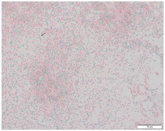 Photomicrograph of a representative high power field (1000× magnification) of sample M (no dilution) containing 3.33 × 108 copies of P. larvae DNA per mL corresponding to approximately 200 million spores in the 1.2 mL sample. Stained with Schaeffer-Fulton’s method; the numerous green ovoid structures are free spores, while the smaller magenta bodies are spores in the late stages of development within P. larvae mother cells. A vegetative P. larvae bacterium is shown with an arrow.