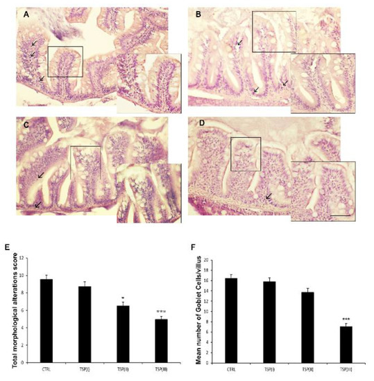 Hematoxylin and eosin (H&E) staining of intestines of (A) zebrafish fed a plant-based diet (control); (B) TSP I, zebrafish fed a plant-based diet supplemented with TSP at 0.9 g/kg of feed; (C) TSP II, zebrafish fed a plant-based diet supplemented with TSP at 1.7 g/kg of feed; and (D) TSP III, zebrafish fed a plant-based diet supplemented with TSP at 3.4g/kg of feed. Scale bar: 100 μm; 50 μm for the higher magnifications. Arrows indicate leucocyte infiltrates; linear boxes depict goblet cells. (E) Bar graph showing the total morphological alteration score (based on the modification of intestinal folds and gut lumen and increases in the numbers of goblet cells and leukocytes) defined for the intestines of each zebrafish group. Data are expressed as means ± SEs. * p < 0.05, *** p < 0.0001 compared to the control group. (F) Bar graph showing the mean number of goblet cells/villi in the intestines of each zebrafish group. Alcian Blue staining was used to count the goblet cells. Data are expressed as means ± SEs. *** p < 0.0001 compared to the control group.