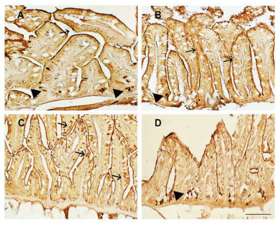 TNFα immunostaining in the intestines of (A) zebrafish fed a plant-based diet (control); (B) TSP I, zebrafish fed a plant-based diet supplemented with TSP at 0.9 g/kg of feed; (C) TSP II, zebrafish fed a plant-based diet supplemented with TSP at 1.7 g/kg of feed; and (D) TSP III, zebrafish fed a plant-based diet supplemented with TSP at 3.4 g/kg of feed. Scale bar: 100 μm. Arrows indicate epithelial cells, and black arrowheads indicate infiltrated leukocytes expressing TNFα.