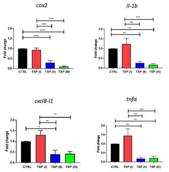 The mRNA expression of cox2, il-1b, cxcl8-l1, and tnfα is reported in Figure 4. Zebrafish fed the plant-based diet (control) and the diet containing TSP at 0.9 g/kg of feed (TSP I) showed similar patterns of inflammatory factors, whereas the double and triple dosages of TSP (the 1.7 and 3.4 g/kg of feed of TSP II and III, respectively) significantly reduced the expression of cox2, il-1b, cxcl8-l1, and tnfα by up to half compared to the control group.