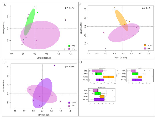 Beta diversity and alpha diversity of the gut microbiota of zebrafish fed a control diet (CTRL), zebrafish fed a diet supplemented with TSP at 0.9 g/kg of feed (TSP I), zebrafish fed a diet supplemented with TSP at 1.7 g/kg of feed (TSP II), and zebrafish fed a diet enriched with TSP at 3.4 g/kg of feed (TSP III). PCoA based on unweighted UniFrac distances between gut microbiota structures of CTRL zebrafish and TSP I (A), TSP II (B), and TSP III (C) zebrafish. In all PCoA plots, samples are not significantly separated (permutation test with pseudo-F ratio, p > 0.05). (D) Boxplots of alpha diversity, measured with Faith’s phylogenetic diversity (PD_whole_tree), Chao1 index, and observed_ASVs. For only the TSP II group, higher values of alpha diversity were observed for all metrics compared to the plant-based-diet group (Wilcoxon rank-sum test, * p ≤ 0.05).