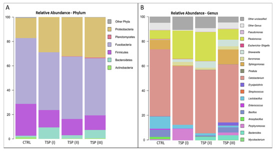 To further assess the GM composition of zebrafish fed different concentrations of TSP, the phylogenetic composition was assessed at the phylum and genus levels, as highlighted in Figure 6A,B, respectively. Overall, similar profiles were found in the GMs of each group in terms of the most abundant bacterial taxa. More specifically, the most abundant phyla were Firmicutes, Fusobacteria, and Proteobacteria, which represented about 94% of the whole intestinal bacterial ecosystem (Figure 6A). On the other hand, Cetobacterium, belonging to the Fusobacteria phylum; Plesiomonas and Sphingomonas, belonging to the Proteobacteria phylum; and Lactobacillus, belonging to the Firmicutes phylum were the most represented genera (Figure 6B).