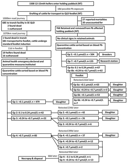 During the dry season on an extensively managed beef cattle property in northern Australia, 1500 twelve- to fifteen-month-old tropically adapted beef heifers (average weight 220 Kg) inadvertently grazed for seven days in a small paddock which had a refuse dump in it containing discarded car and truck batteries. Several years prior, a fire had burnt through this paddock melting the external casing of many of the batteries exposing the lead sheets within each. Ten days later the cattle were again walked through this paddock as they were moved to the cattle yards for drafting into two cohorts (cull and potential replacement breeding animals). One day later, 685 cull heifers (first cohort) were transported by road-train to a southern Queensland feedlot via a transit facility. No cattle were returned to the refuse dump paddock.