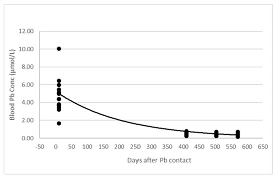 Figure 4 depicts the blood lead concentration depletion curve for the 14 first cohort heifers with persistently high blood lead concentration.