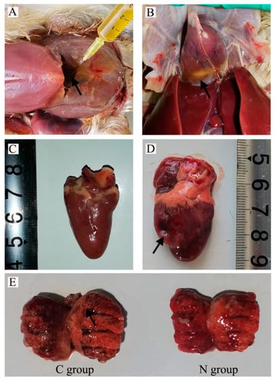 Dissection of the lesions associated with broiler ascites syndrome (arrow). (A) Removal of a large amount of yellow fluid accumulated in the abdominal cavity. (B) Obvious pericardial effusion. (C) Normal broiler heart. (D) Ascites syndrome broiler heart showing significantly increased heart volume, and the right ventricle dilated and thinned. (E) C group: ascites syndrome broiler enlarged lungs with gray and white striations in the interstitium. N group: normal broiler lungs.