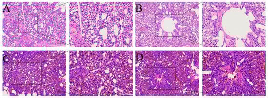 Hematoxylin and eosin-stained lung tissue (200×/400×). (A,B) The normal group. A: the pulmonary tissue structure and pulmonary vascular wall. B: the lung chamber. (C,D) The model group. (C) Pulmonary congestion and respiratory capillary atrophy. (D) Pulmonary atrial stenosis.
