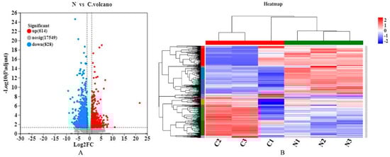 A total of 1442 differentially expressed genes were identified in the lung tissues of groups N and C (p-adjust < 0.05, |log2FC| ≥ 1), of which 614 genes were up-regulated and 828 were down-regulated (Figure 3A). Table 6 lists the top 10 up-regulated and down-regulated genes. A cluster analysis shows the expression patterns of differentially expressed genes (Figure 3B).
