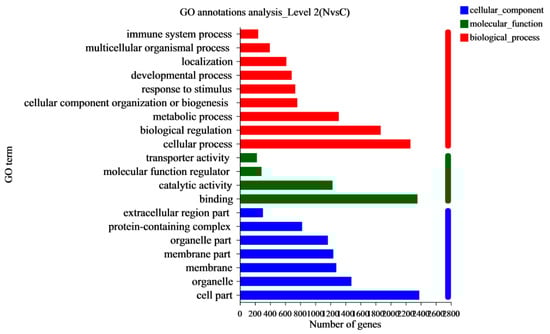 Genetic ontology analysis and classification statistics. The ordinate represents the second-level classification, and the abscissa represents the number of genes. The different colors represent molecular function, cellular components, and biological processes.
